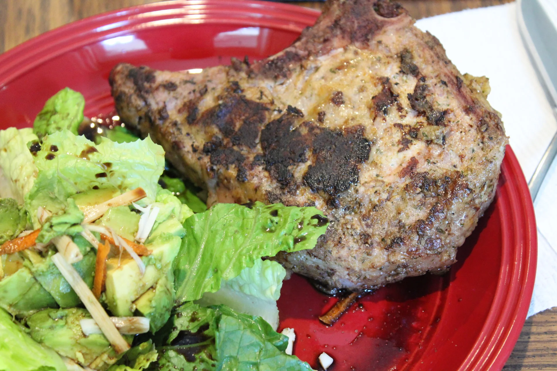 This is a simple dinner at first look. But a closer look and a forkful will tell you a different story. This is an inch & 1/4 massive pork chop encrusted with pecans. It was cooked for 3.5 hours at 130 degrees sous vide before being finished over a bed of charcoal for a nice sear and served medium.